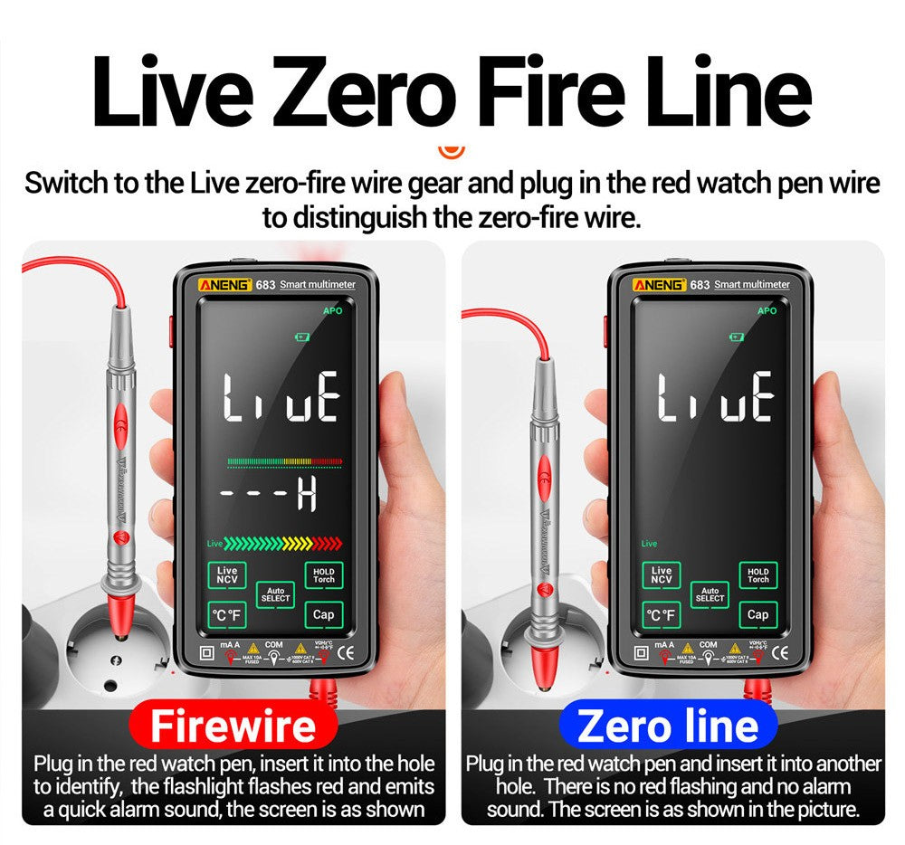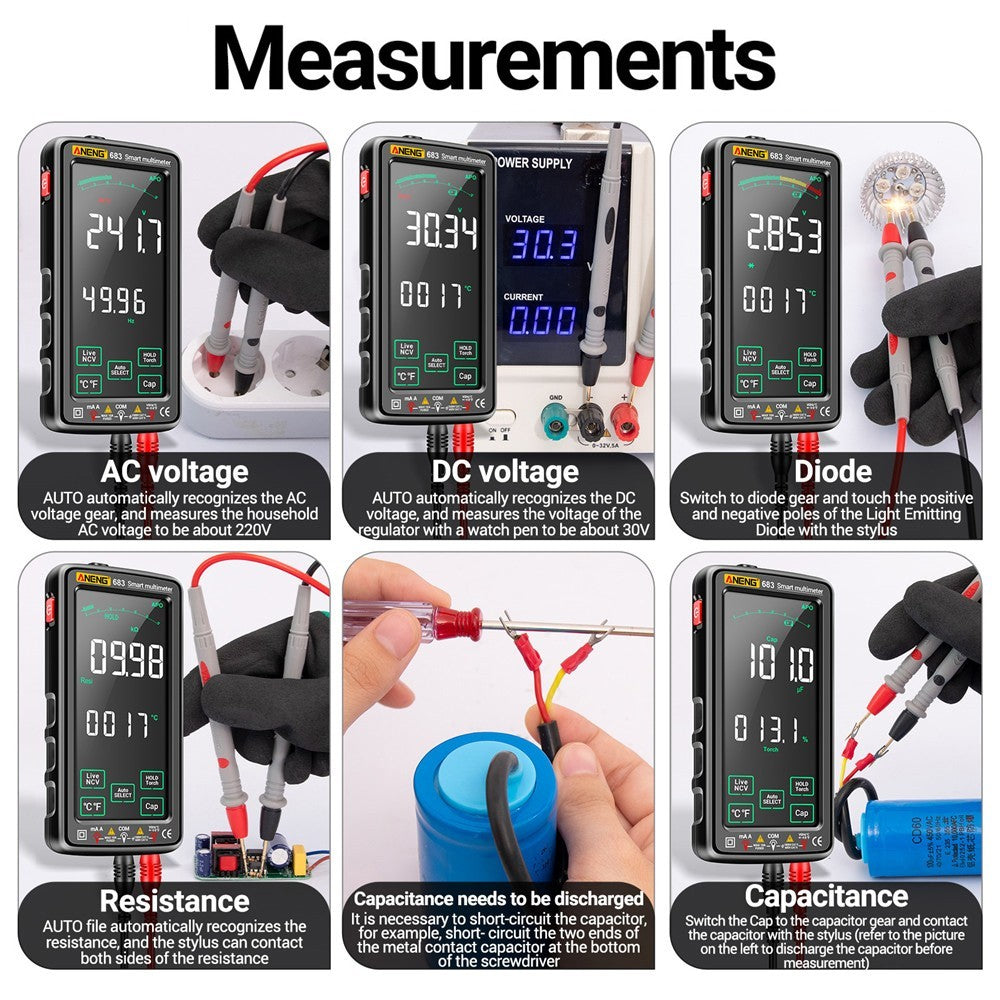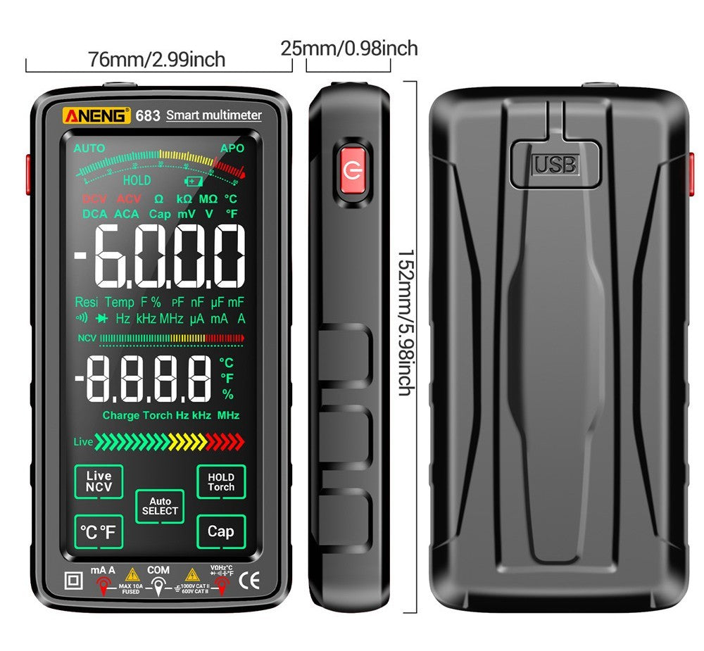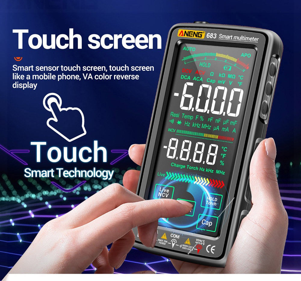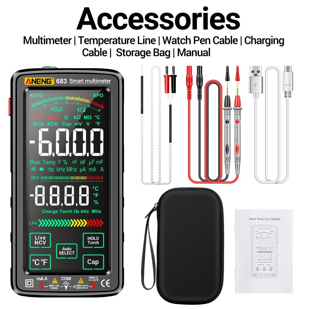 ANENG 683 is a digital multimeter with stable performance and reliable quality. The meter adopts an LCD display screen which has a smart sensor touch design and VA color reverse display. The input AC/DC voltage/resistance will be automatically identified and measured.