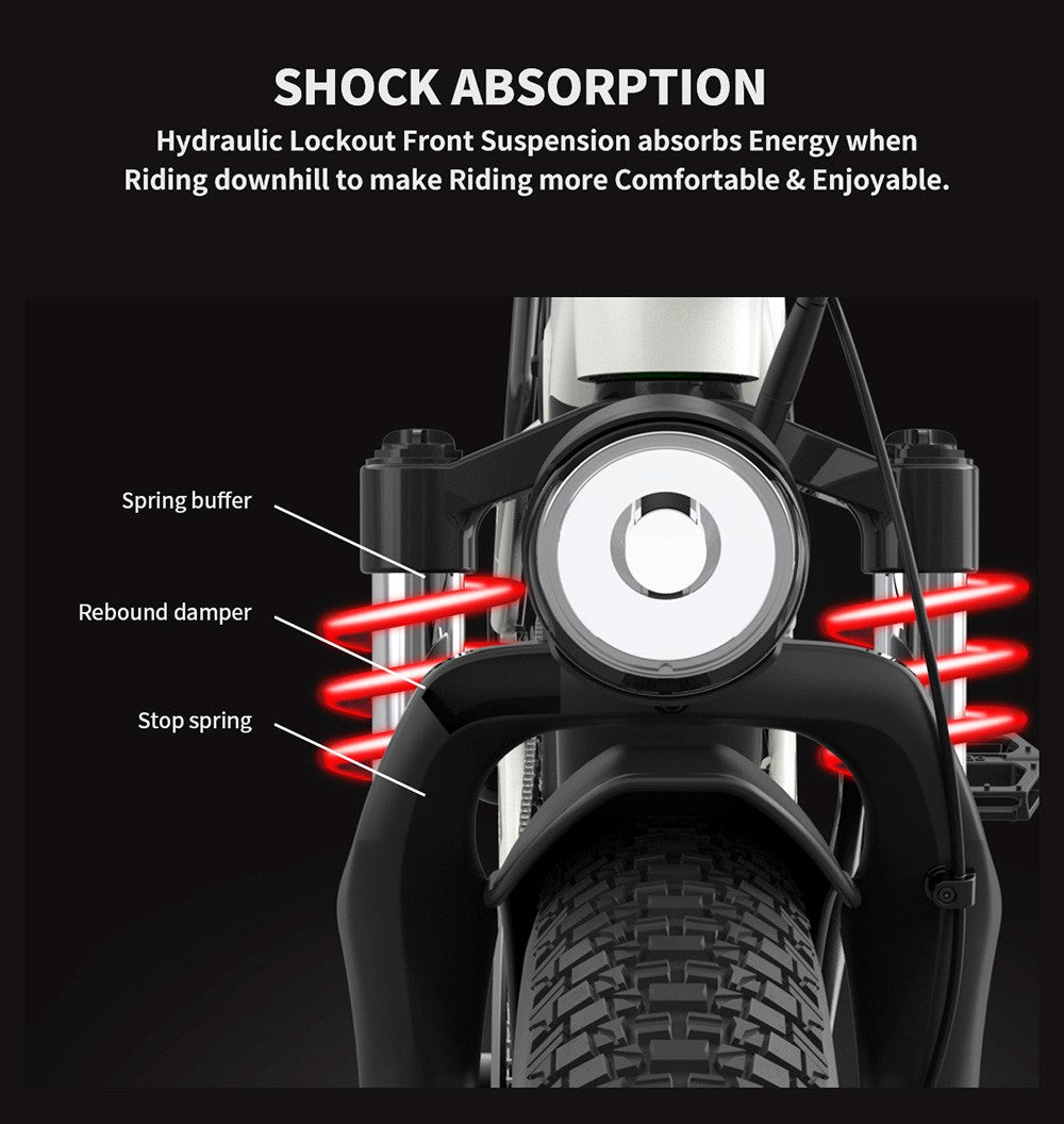 Hydraulic lockout front suspension absorbs energy when riding downhill to make riding more comfortable and enjoyable.