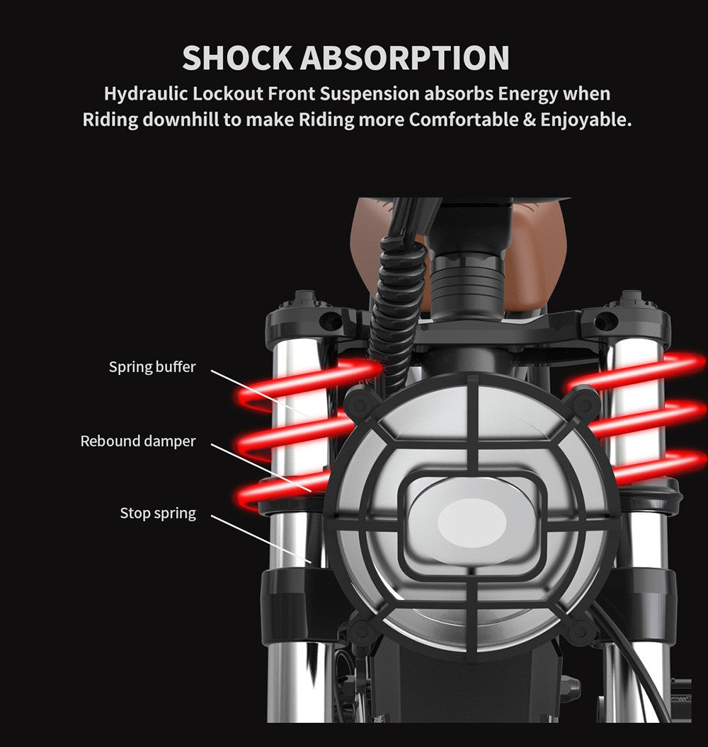 Hydraulic lockout front suspension absorbs energy when riding downhill to make riding more comfortable and enjoyable.