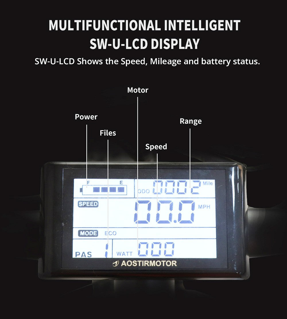 SW-U-LCD shows the speed, mileage, and state of the batteries' charge.