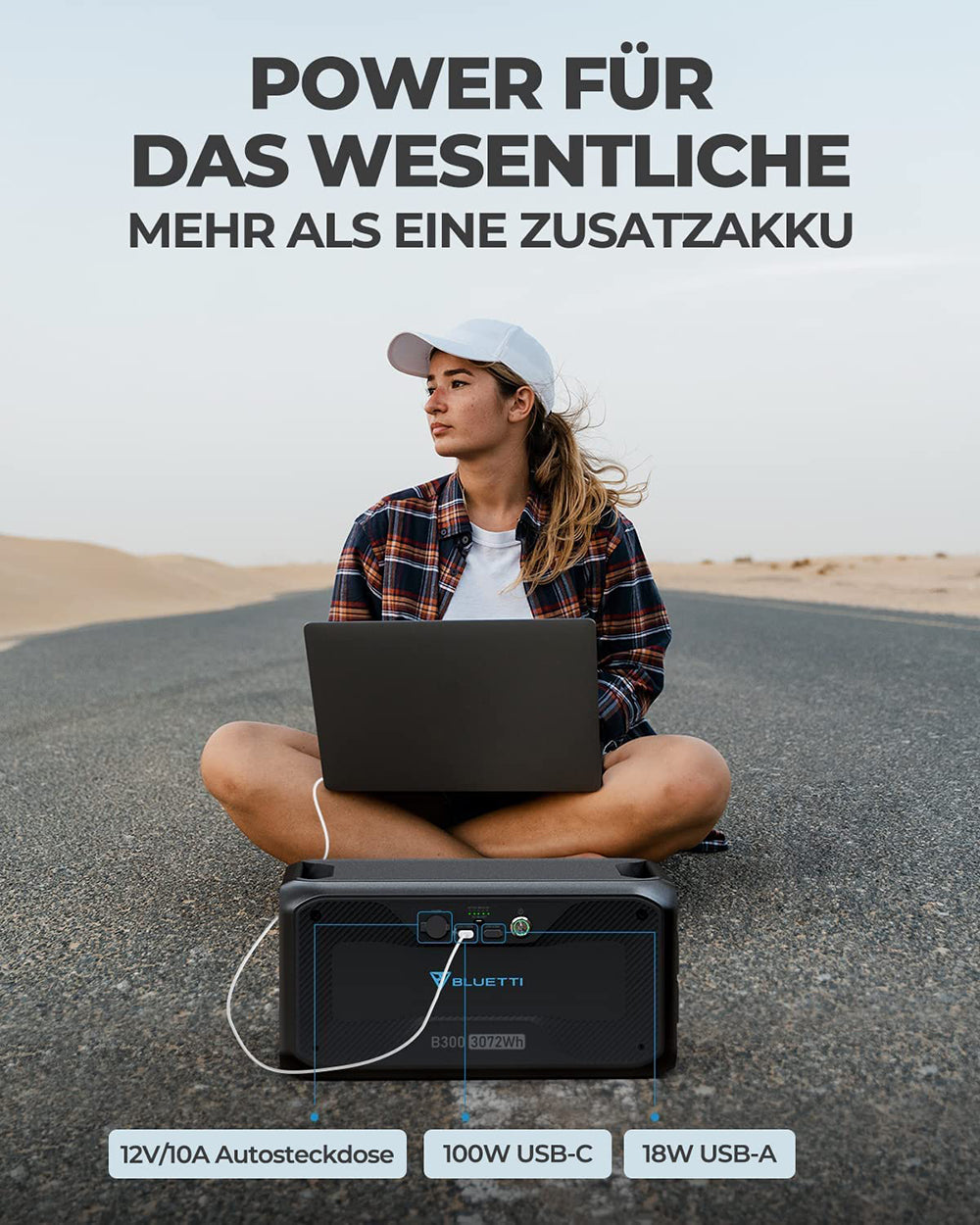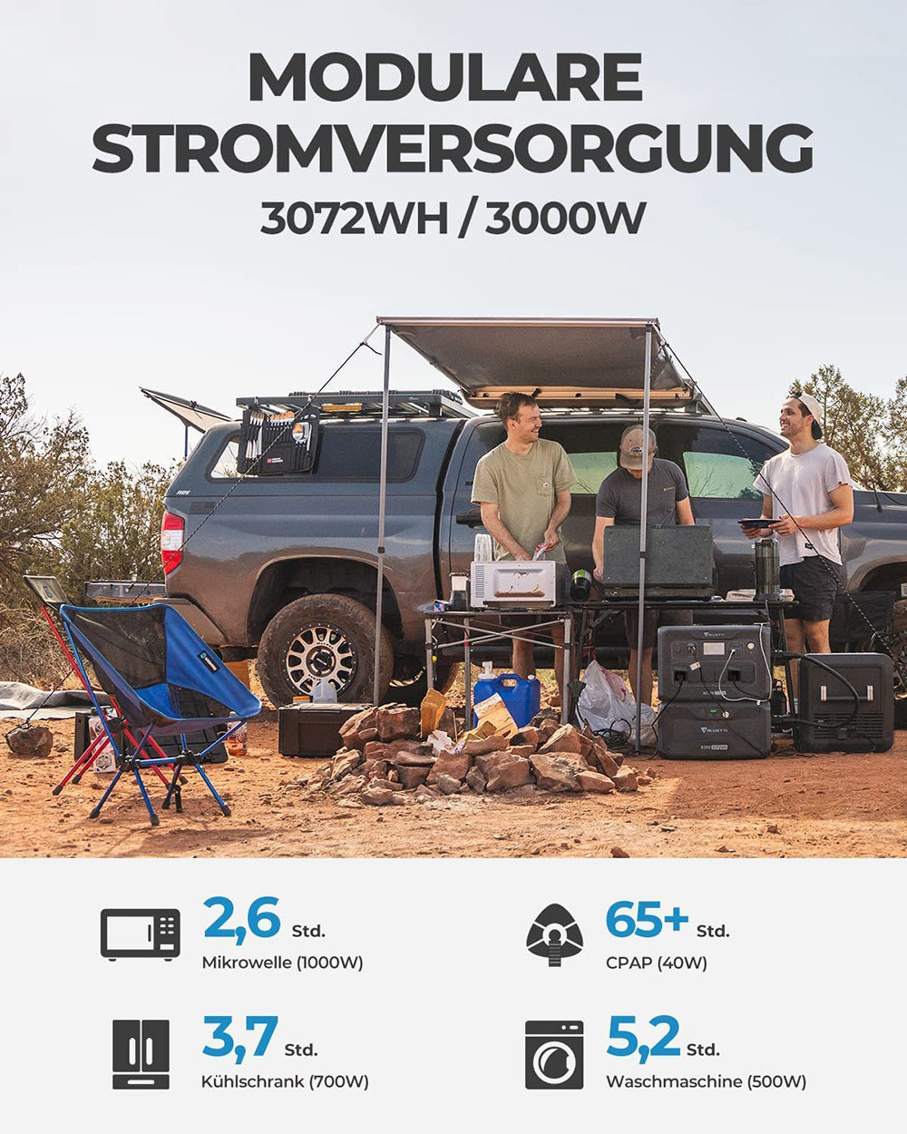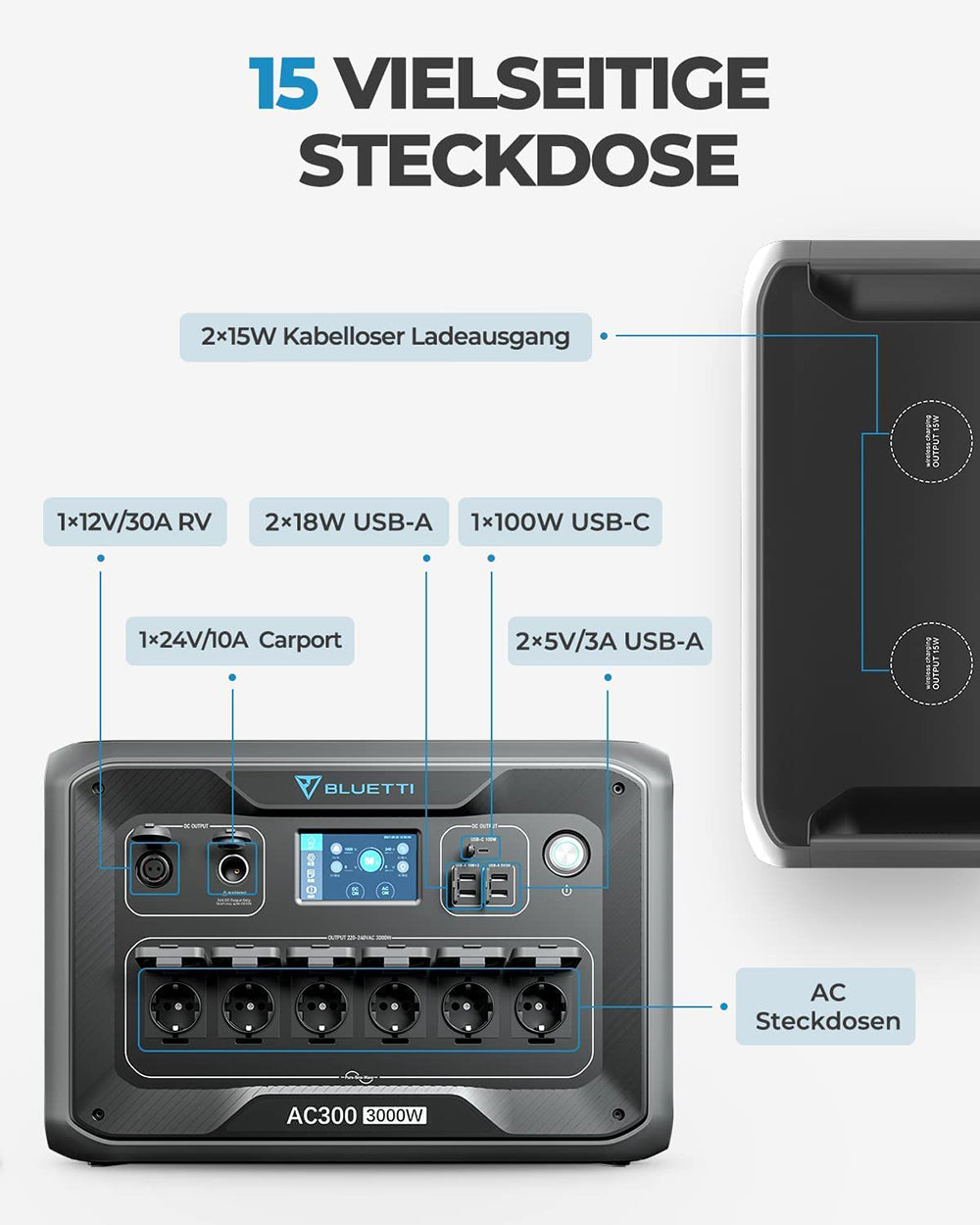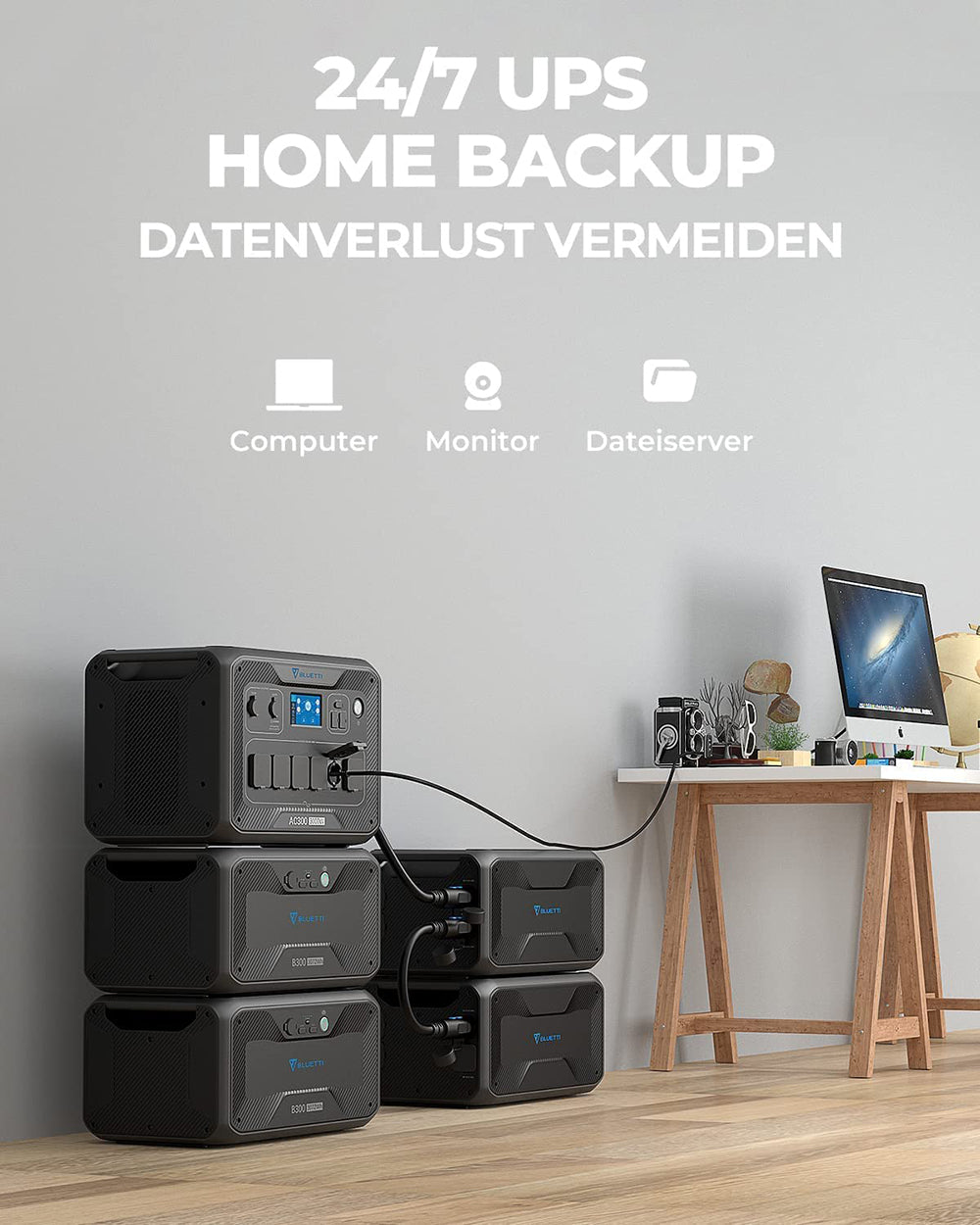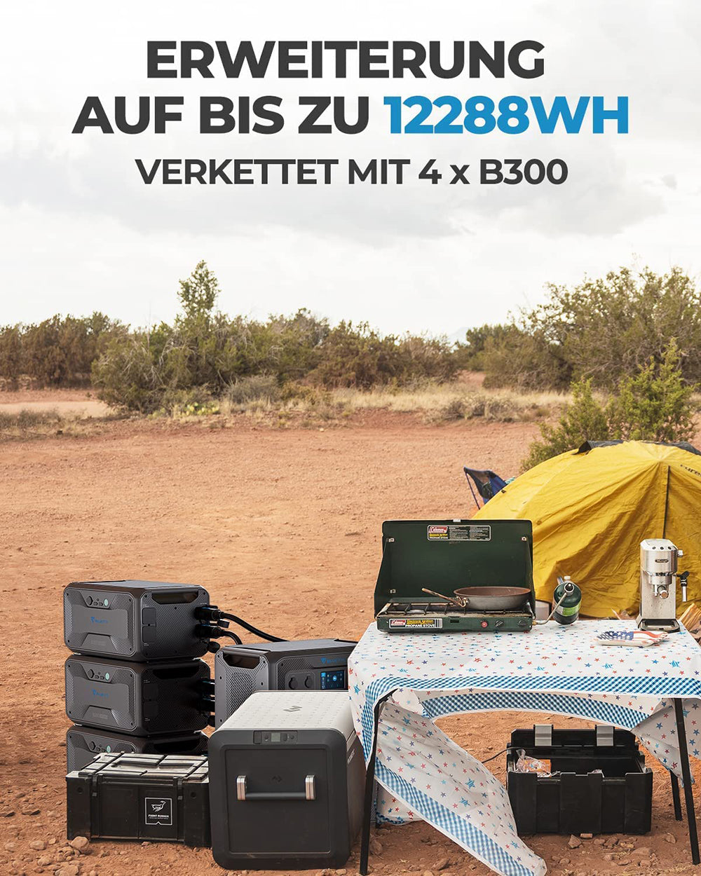 BLUETTI AC300 is 100% modular and can accept up to 4xB300 (3,072Wh per pack) battery modules per unit, adding up to a total of groundbreaking 12,288Wh – Power your whole family basic needs for days during emergencies or power outages. (Must work with B300)