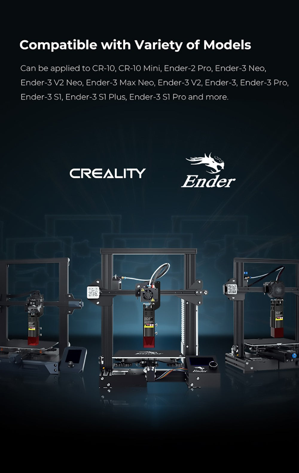 It can be applied to CR-10, CR-10 Mini, Ender-2 Pro, Ender-3 Neo, Ender-3 v2 Neo, Ender-3 Max Neo, Ender-3 V2, Ender-3, Ender-3 Pro, Ender-3 S1, Ender-3 S1 Pro, Ender-3 S1 Plus and more.