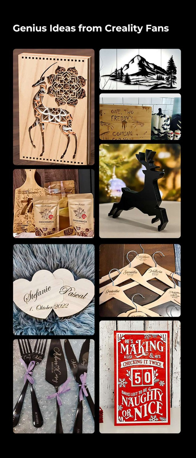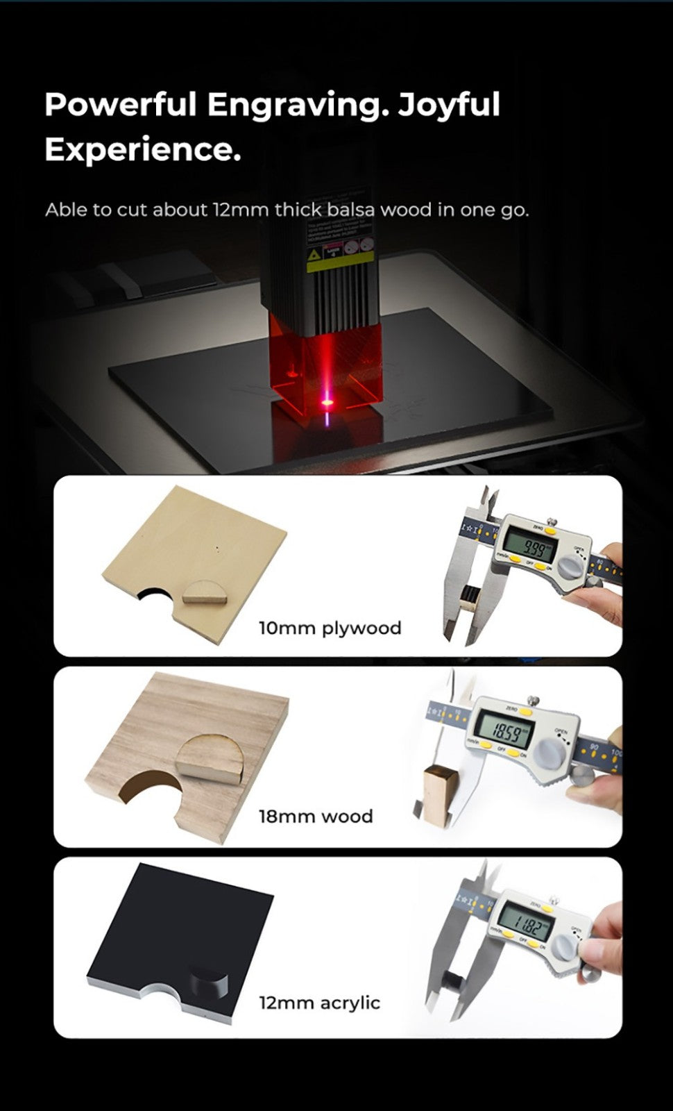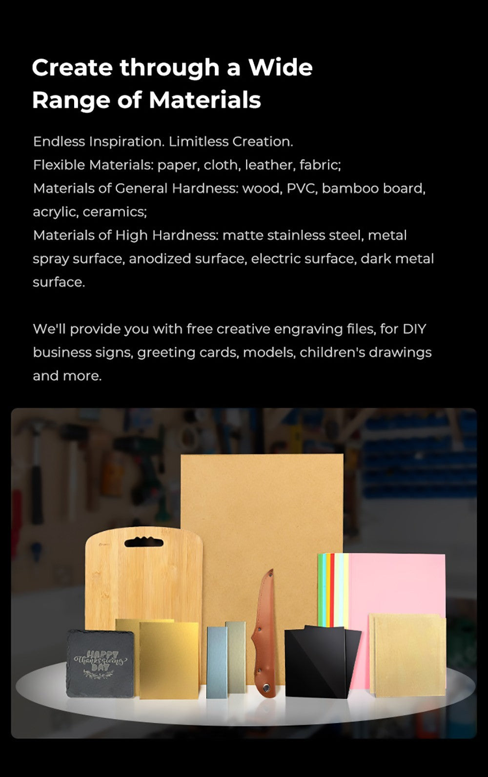 | Supported Material | Cardboard, wood, bamboo, rubber, leather, fabric, plastic, acrylic, lacquered metal, etc. |