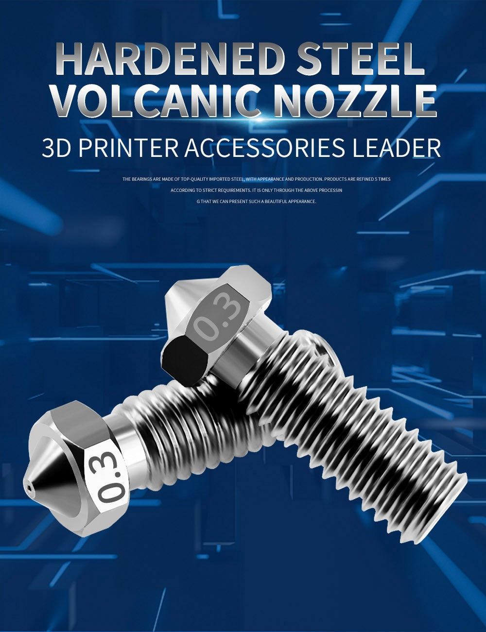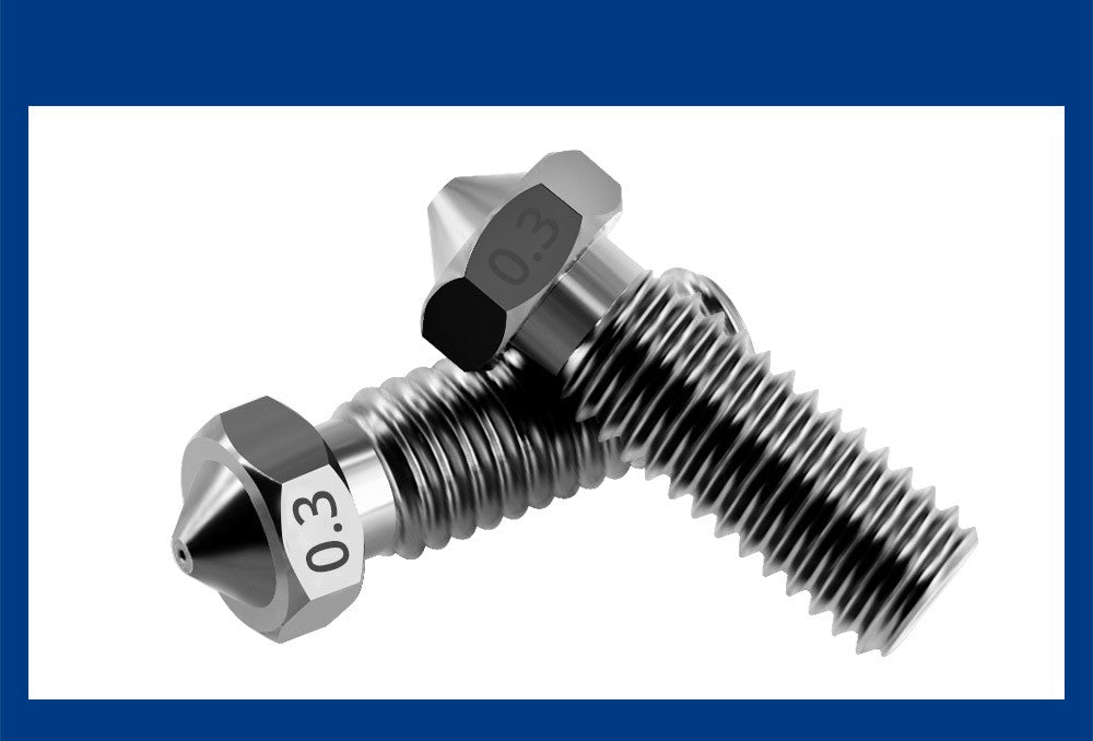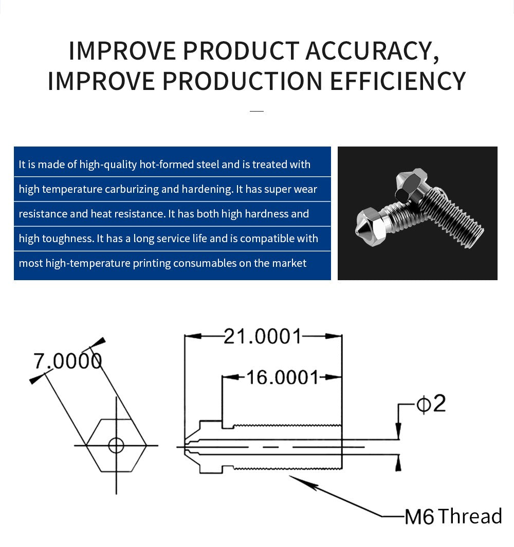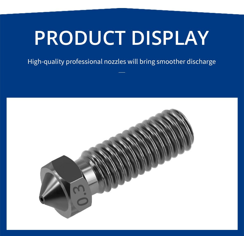 1. Adopting high-quality thermoforming, high-temperature carburizing, and hardening treatment, this nozzle has super wear resistance, heat resistance, high hardness, high toughness, and long service life. It is compatible with most high-temperature printing filaments on the market.