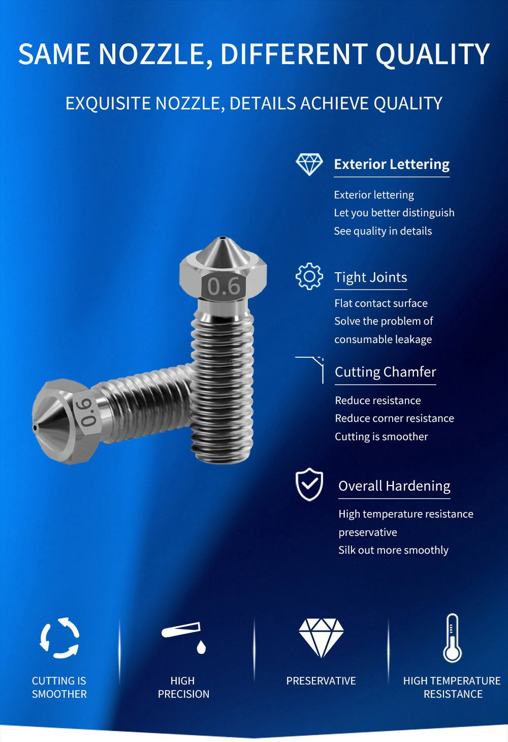 1. Adopting high-quality thermoforming, high-temperature carburizing, and hardening treatment, this nozzle has super wear resistance, heat resistance, high hardness, high toughness, and long service life. It is compatible with most high-temperature printing filaments on the market.