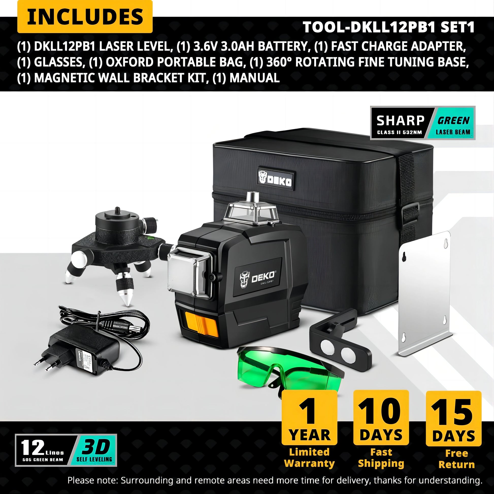 Nivel láser autonivelante DEKO 4D de 16/12 líneas, 360 grados, líneas cruzadas horizontales y verticales, rayo láser verde con trípode, herramientas eléctricas