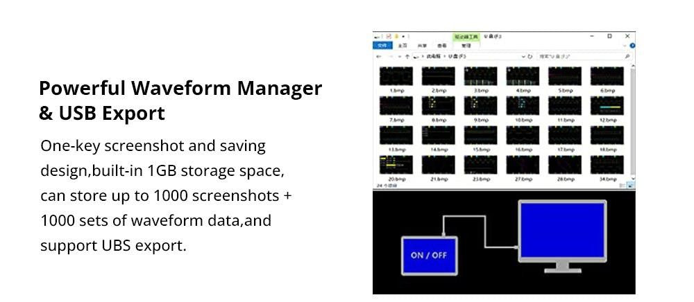 Equipado con un eficiente dispositivo automático de un solo botón. Guardado de formas de onda y capturas de pantalla con un solo clic. El espacio de almacenamiento integrado de 1 GB puede almacenar hasta 1000 capturas de pantalla y 1000 conjuntos de datos de forma de onda. El potente gestor de imágenes de forma de onda admite la navegación en miniatura, la visualización, la visualización detallada, el cambio de página, la eliminación y el zoom de la forma de onda (acercar, alejar, mover, etc.).