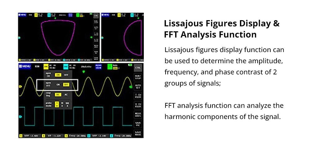 La función de visualización gráfica de Lissajous se puede utilizar para comparar la amplitud, la frecuencia y la fase de los dos conjuntos de señales. La función de visualización FFT puede realizar una estimación aproximada del contenido armónico de la señal.