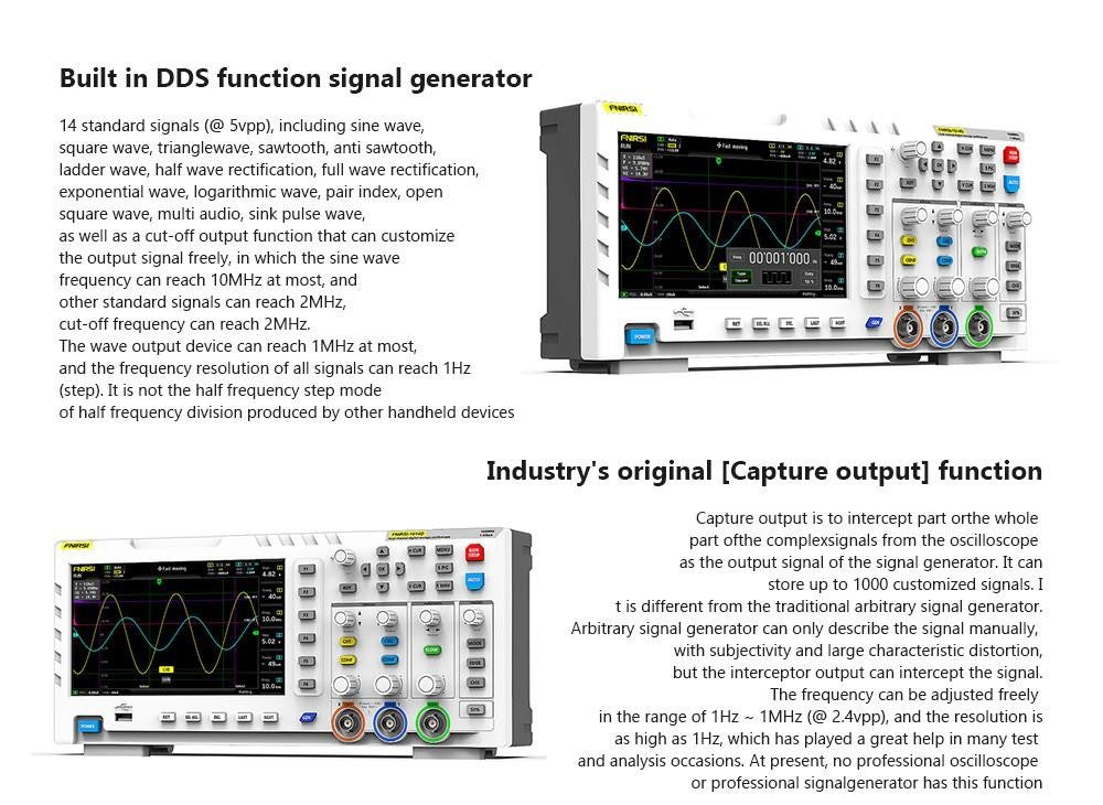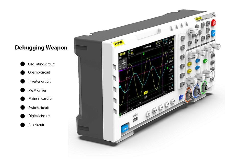 El FNIRSI 1014D es un osciloscopio y generador de señales 2 en 1, con una frecuencia de muestreo en tiempo real de hasta 1 GSA/S y un ancho de banda analógico de 100 MHZ * 2. El osciloscopio FNIRSI tiene una función de disparo completa (simple/normal/automática), y puede utilizarse libremente tanto para señales analógicas periódicas como para señales digitales aperiódicas.