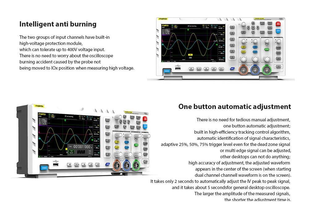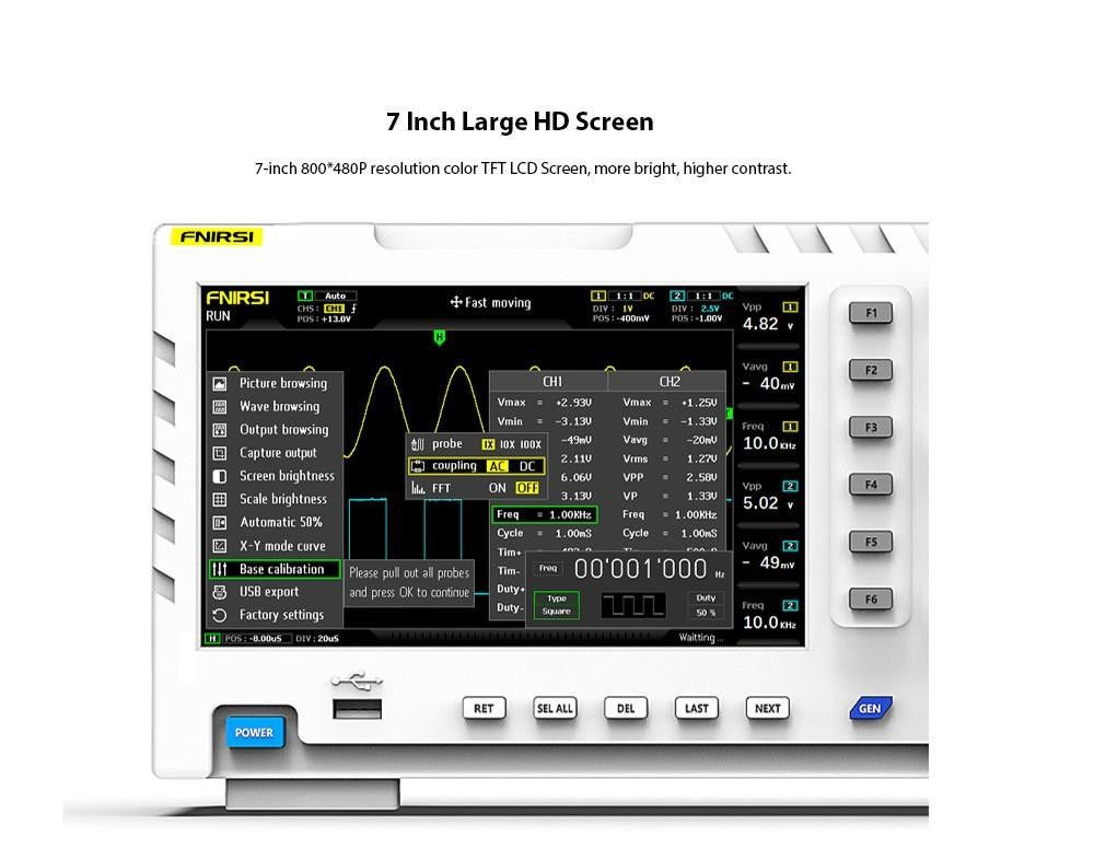 Equipado con AUTO de un botón de alta eficiencia, disparador adaptable al 25%, 50% y 75%, el FNIRSI 1014D puede mostrar la forma de onda medida sin ajustes engorrosos; la pantalla está equipada con una pantalla LCD de alta definición de 7 pulgadas con una resolución de 800*480.