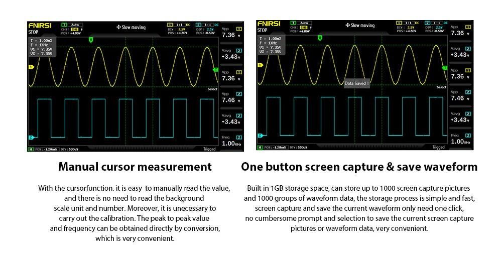 Cuenta con función de medición por cursor; al leer manualmente los parámetros de amplitud y frecuencia, no es necesario leer la unidad y la cantidad de la escala de fondo, y se puede obtener directamente el valor pico a pico y la frecuencia sin conversión.