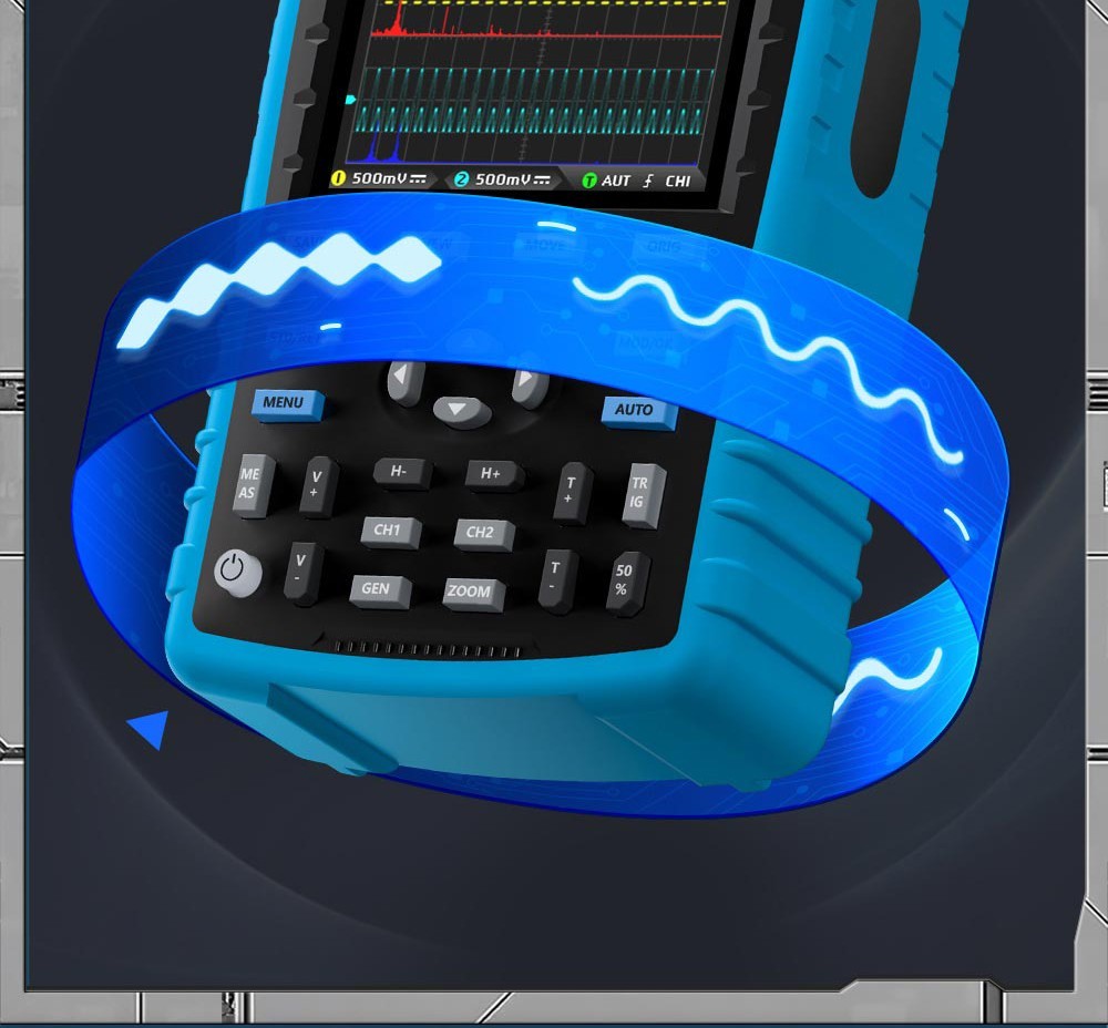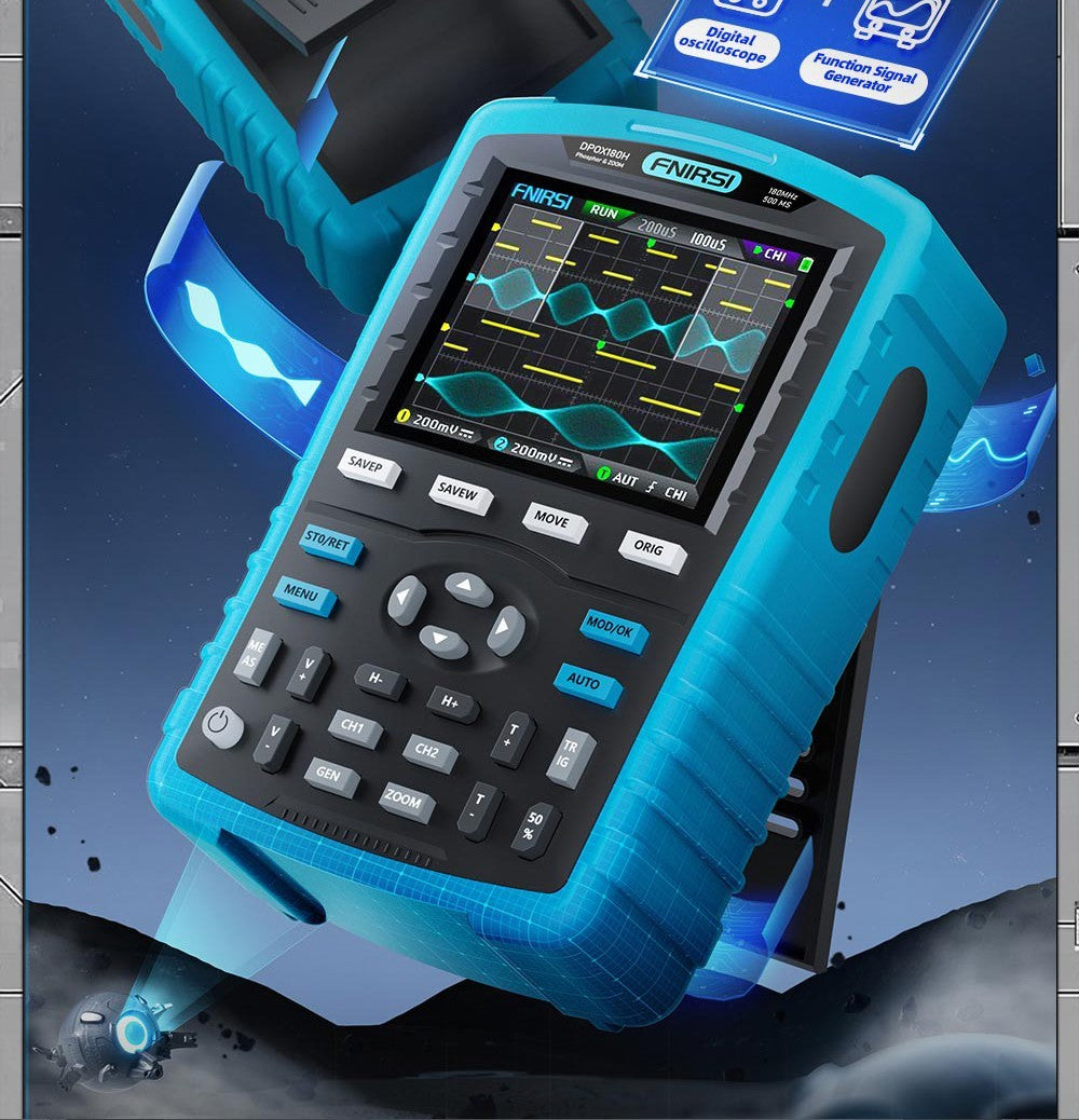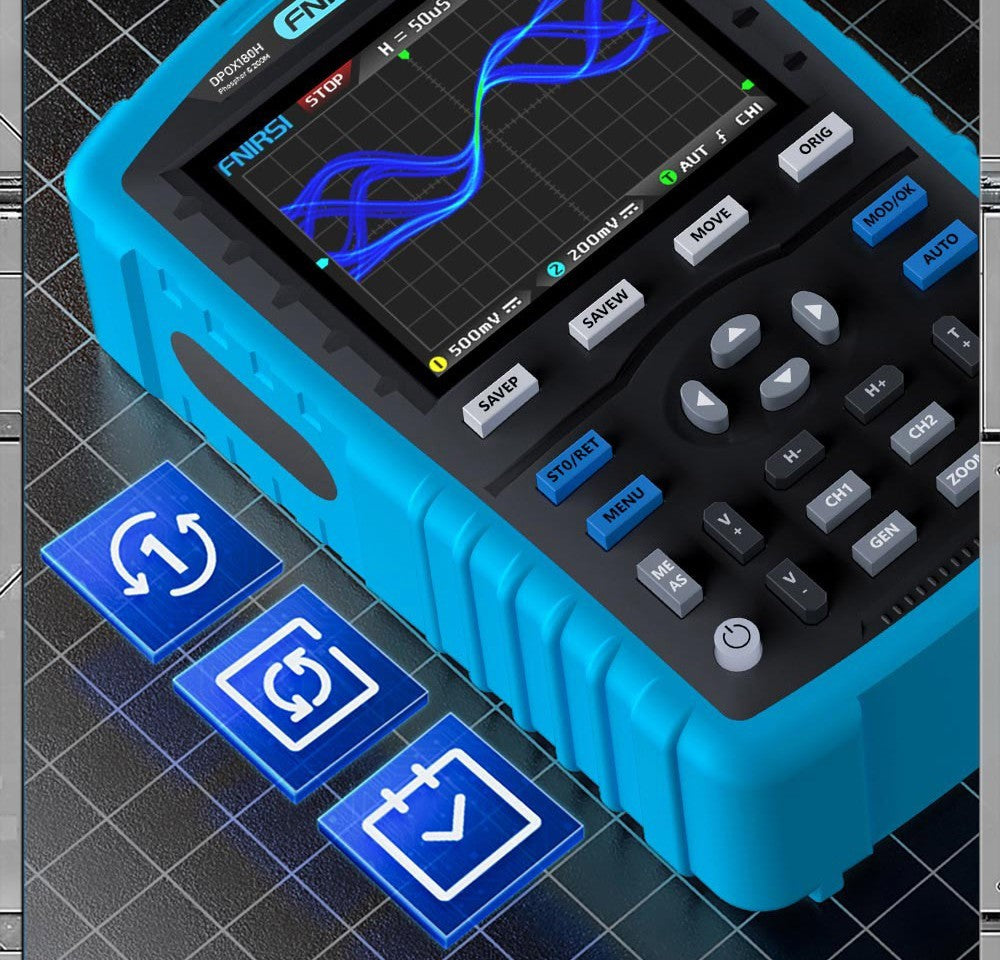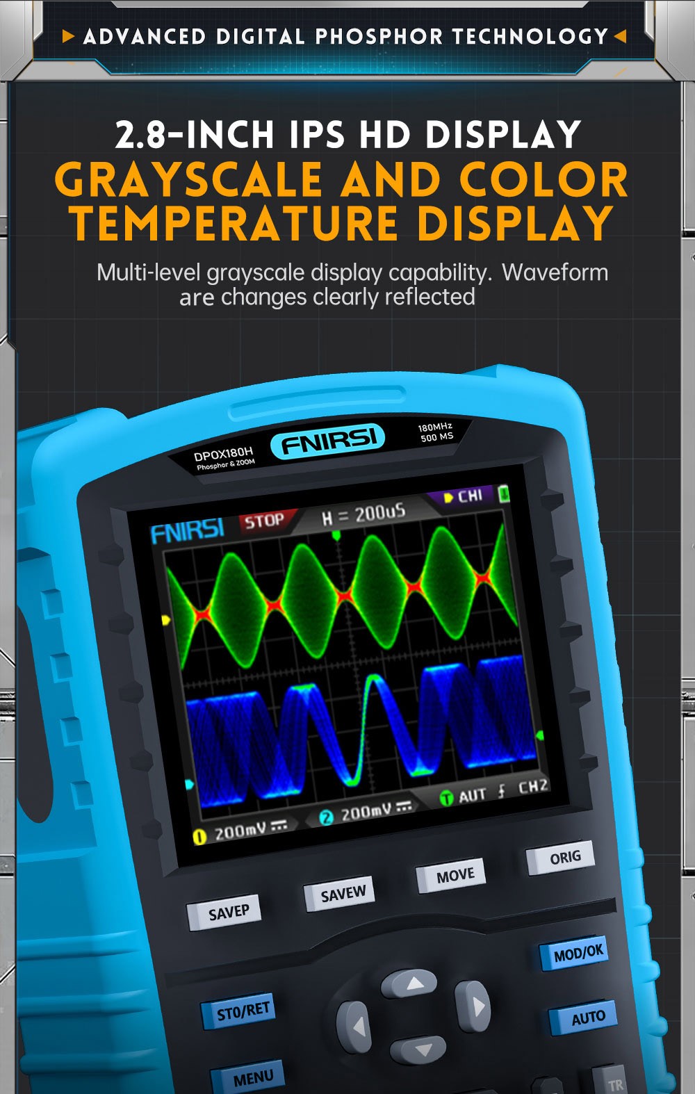 El DPOX180H es un osciloscopio de fósforo digital de 2 canales portátil y rentable con función de generador de señales. El osciloscopio tiene una frecuencia de muestreo en tiempo real de 500 MSPS y un ancho de banda analógico de 180 MHz. En cuanto a la pantalla, utiliza una pantalla LCD IPS de visión completa de 2,8 pulgadas de alto contraste y tecnología fluorescente digital. El efecto de visualización de la forma de onda es bueno, y las combinaciones de colores son en escala de grises y temperatura de color.