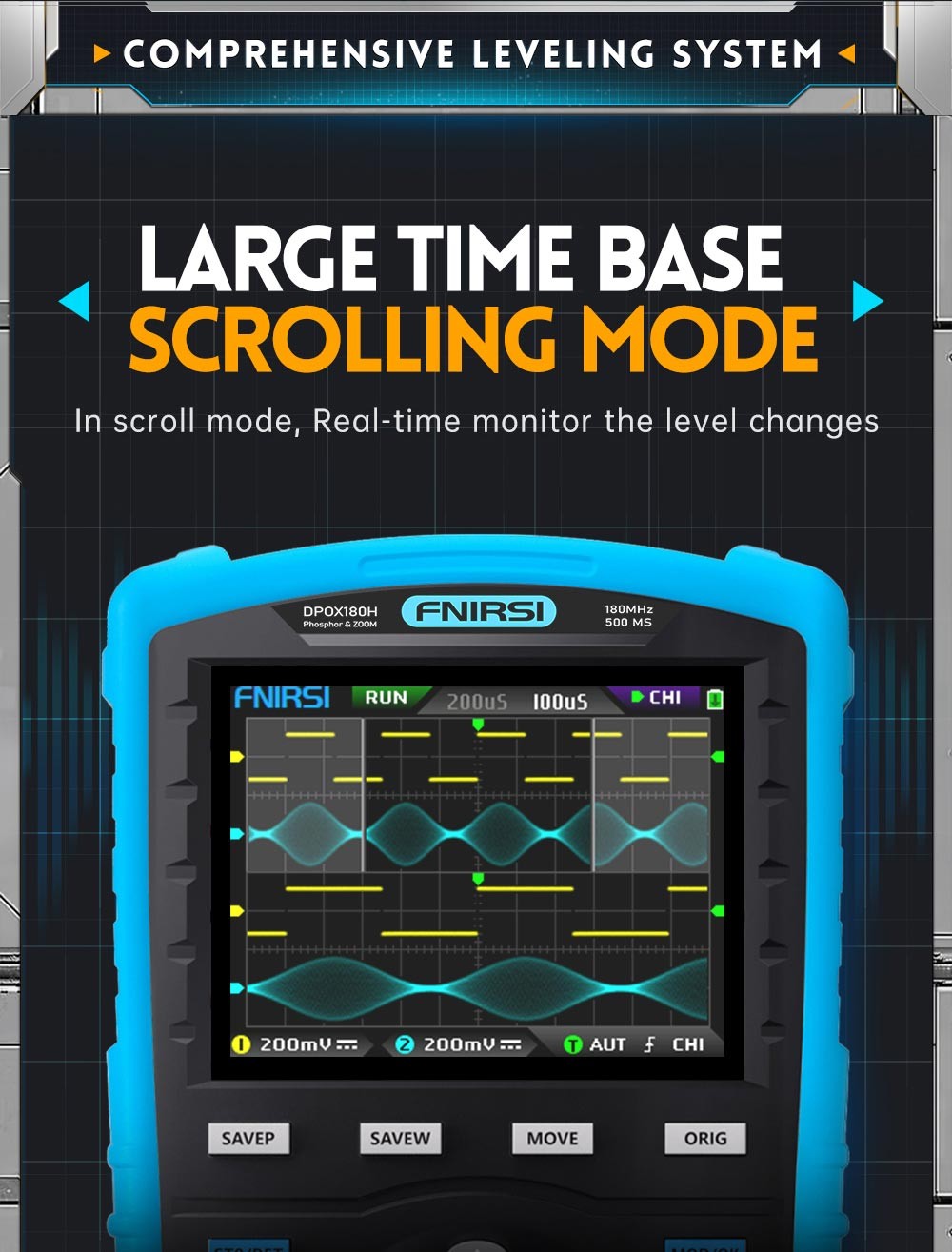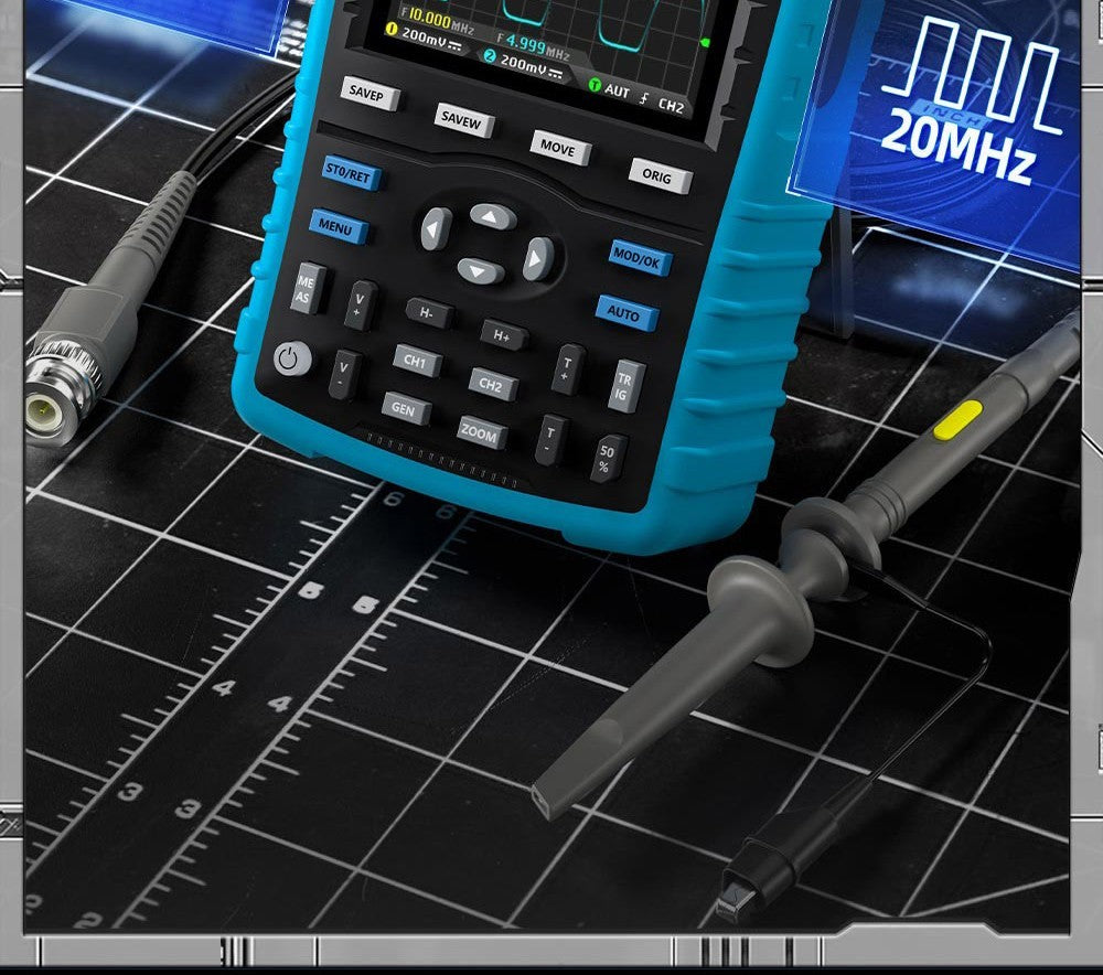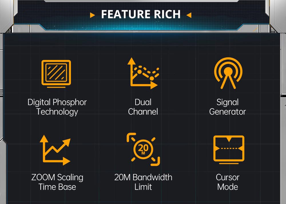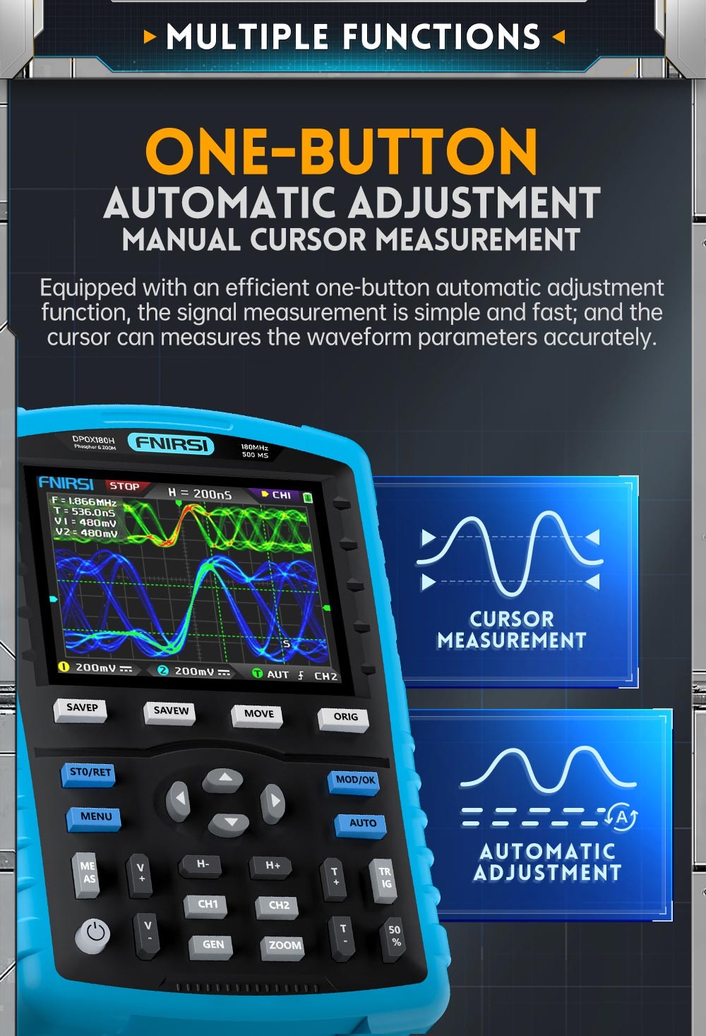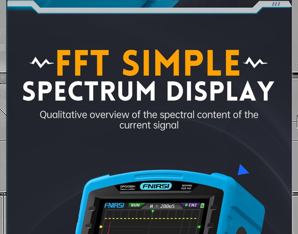 El DPOX180H es un osciloscopio de fósforo digital de 2 canales portátil y rentable con función de generador de señales. El osciloscopio tiene una frecuencia de muestreo en tiempo real de 500 MSPS y un ancho de banda analógico de 180 MHz. En cuanto a la pantalla, utiliza una pantalla LCD IPS de visión completa de 2,8 pulgadas de alto contraste y tecnología fluorescente digital. El efecto de visualización de la forma de onda es bueno, y las combinaciones de colores son en escala de grises y temperatura de color.