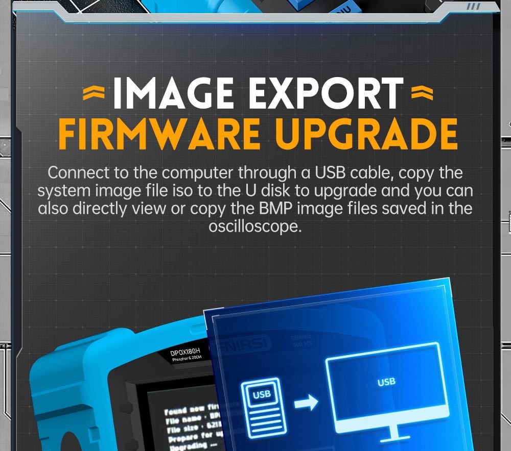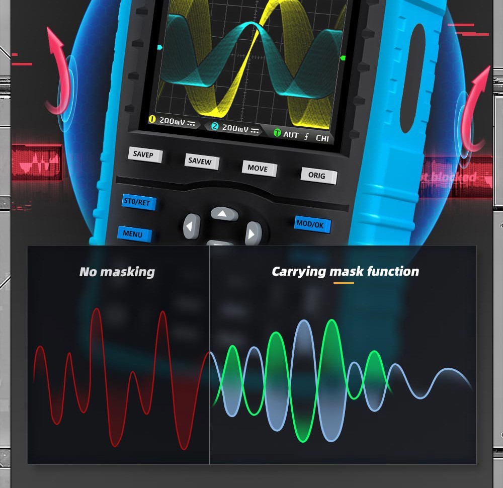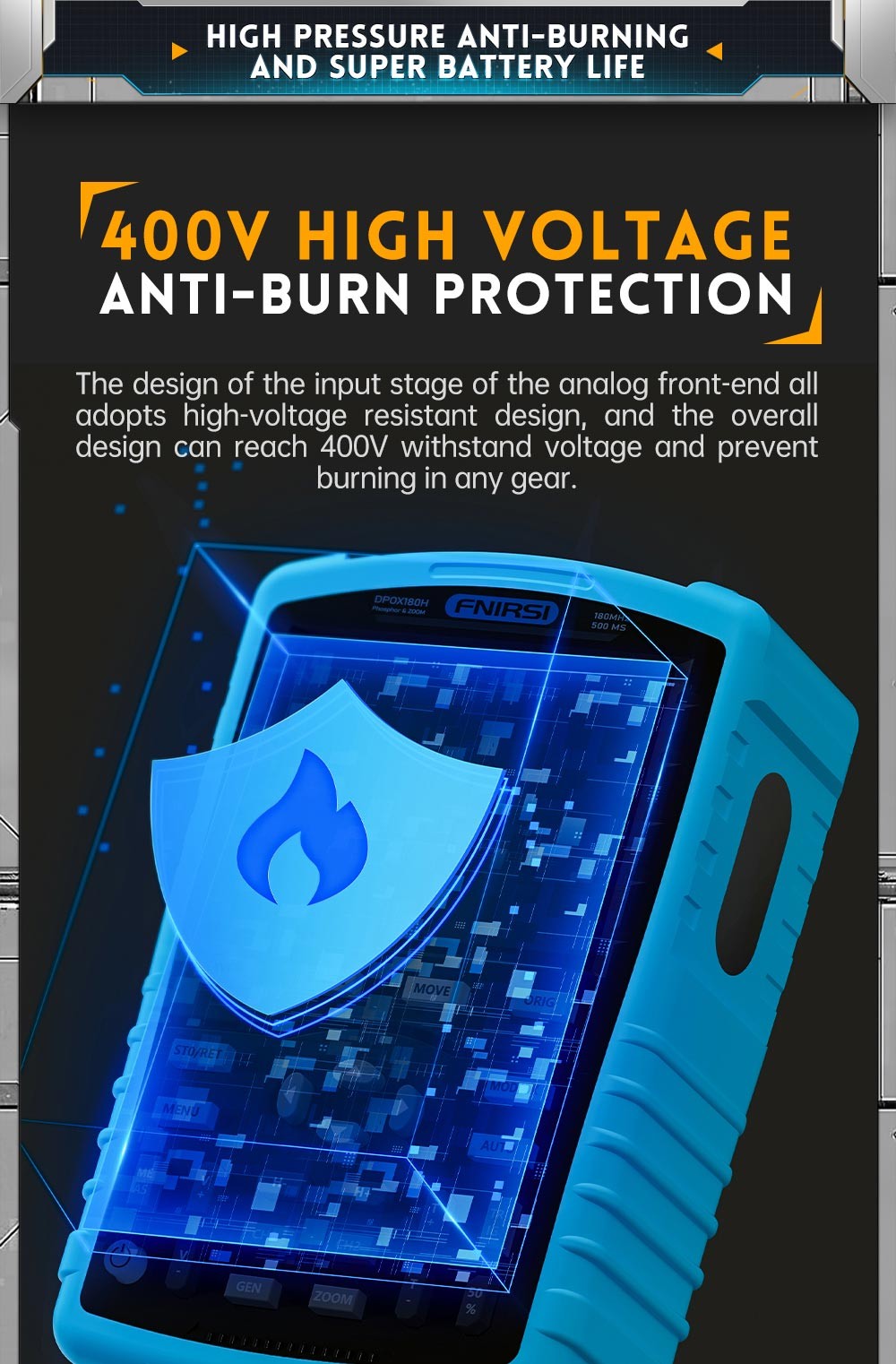 Con protección anti-quemaduras de alto voltaje, todos los engranajes pueden soportar alto voltaje hasta 400V. Exportación de datos USB, puede conectarse a una computadora para copiar archivos de imagen y copiar archivos del sistema al osciloscopio para actualizaciones del sistema. Carga rápida de 5V2A y 1 hora puede cargar hasta el 80%.