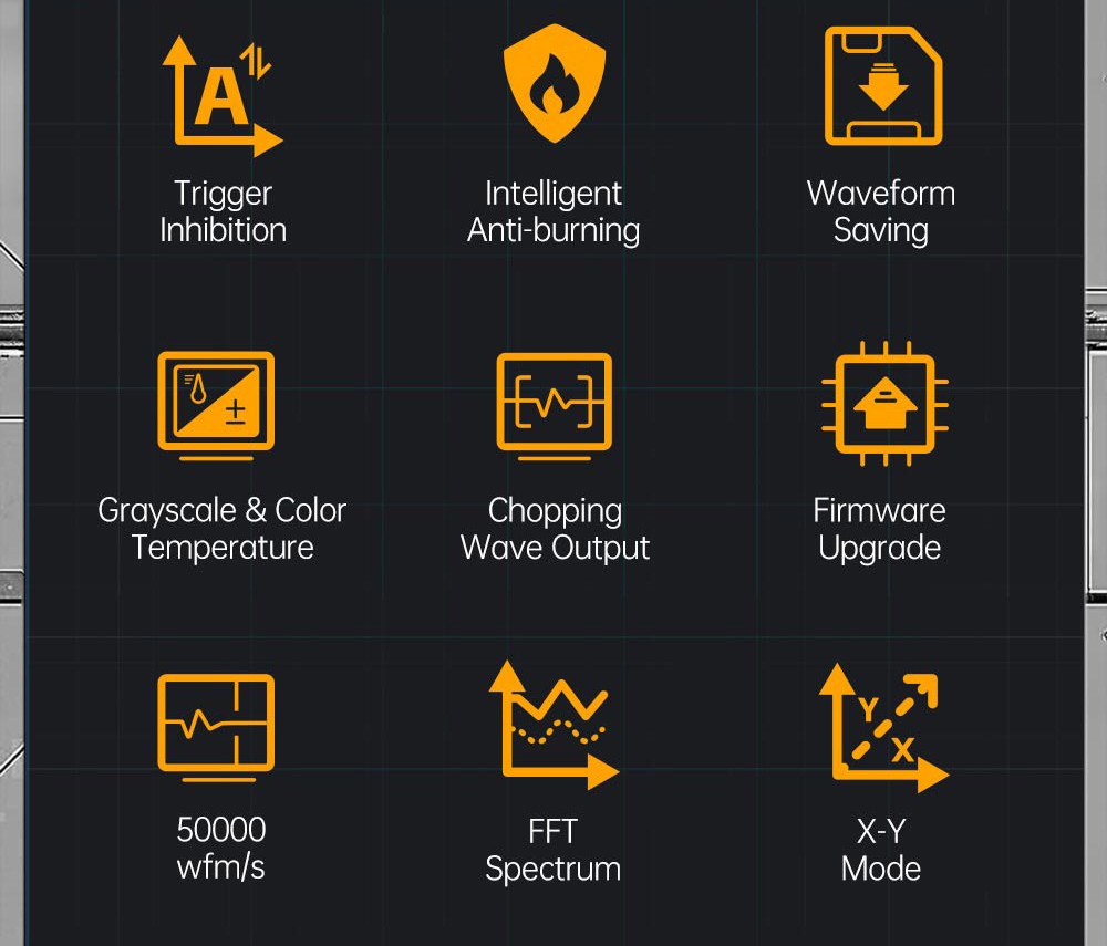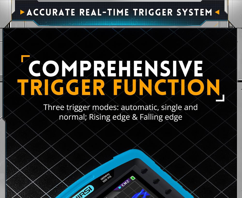 Puede filtrar el ruido por encima de 20 MHz. El disparador adopta tecnología de disparo digital de alta precisión. Tiene tres modos de disparo: automático/único/normal. Además, tiene una gran capacidad para capturar señales periódicas, señales de ráfaga y señales de protocolo.
