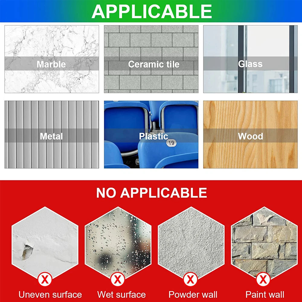 1.Nano gel tape is suitable for almost any smooth, clean and dry surface, It's special nano formula compensates for minor surface irregularities