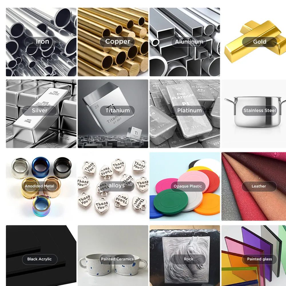Engraving Materials:Various metals (such as gold, silver, copper, aluminum, iron, stainless steel, etc.), ABS, acrylic, PC, leather, stone, etc.