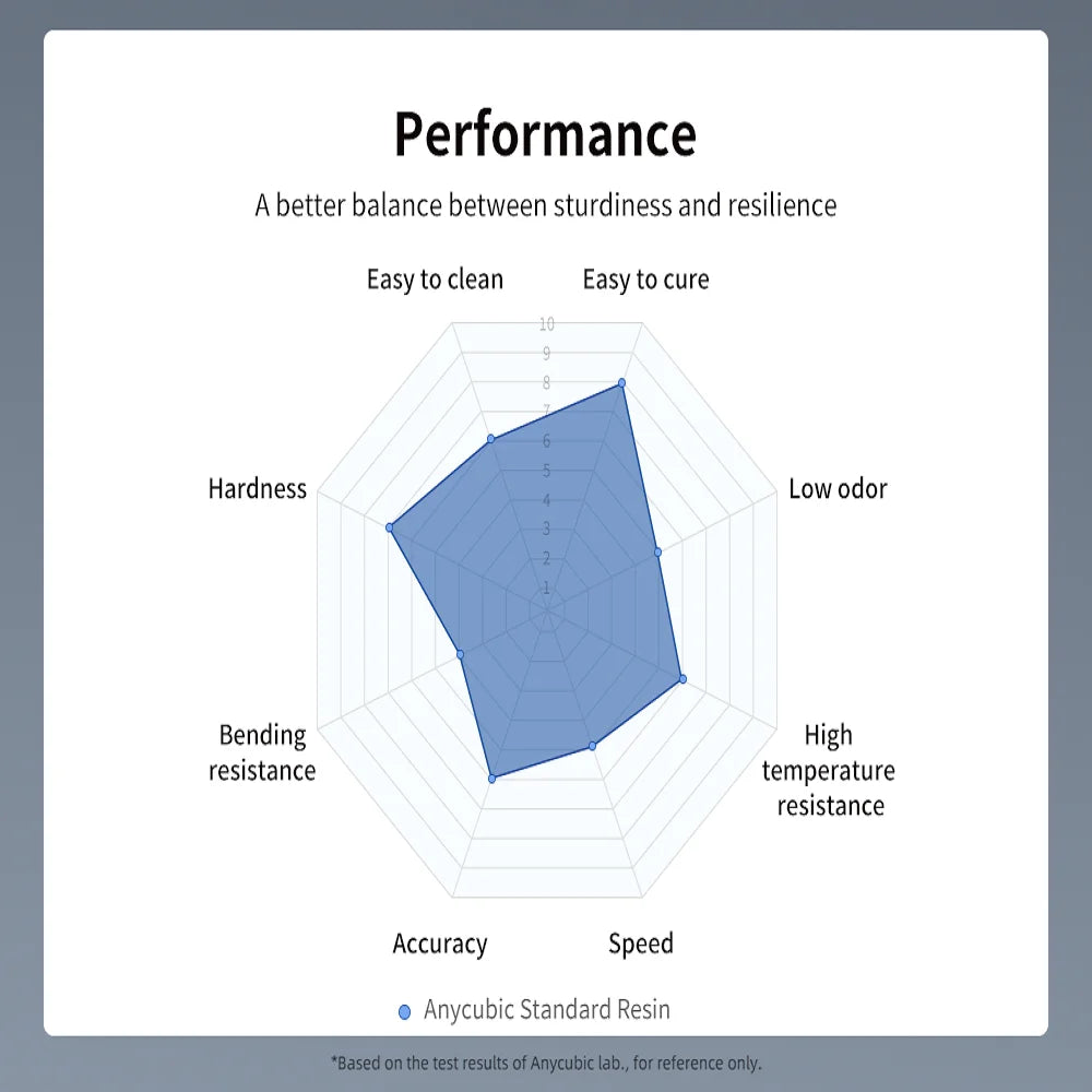 As the best-selling resin of Anycubic, this Standard Colored UV Resin delivers balanced performance in terms of printing success rate, stickiness with print bed, model details, printing precision, hardness, resilience, smell, fluidity and ease in cleaning.