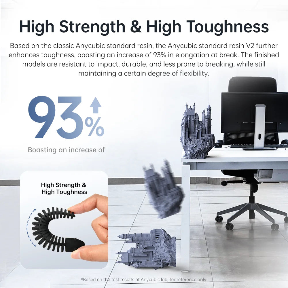 Based on the classic Anycubic standard resin, the Anycubic standard resin V2 further enhances toughness, boasting an increase of 93% in elongation at break. The finished models are resistant to impact, durable, and less prone to breaking, while still maintaining a certain degree of flexibility.
