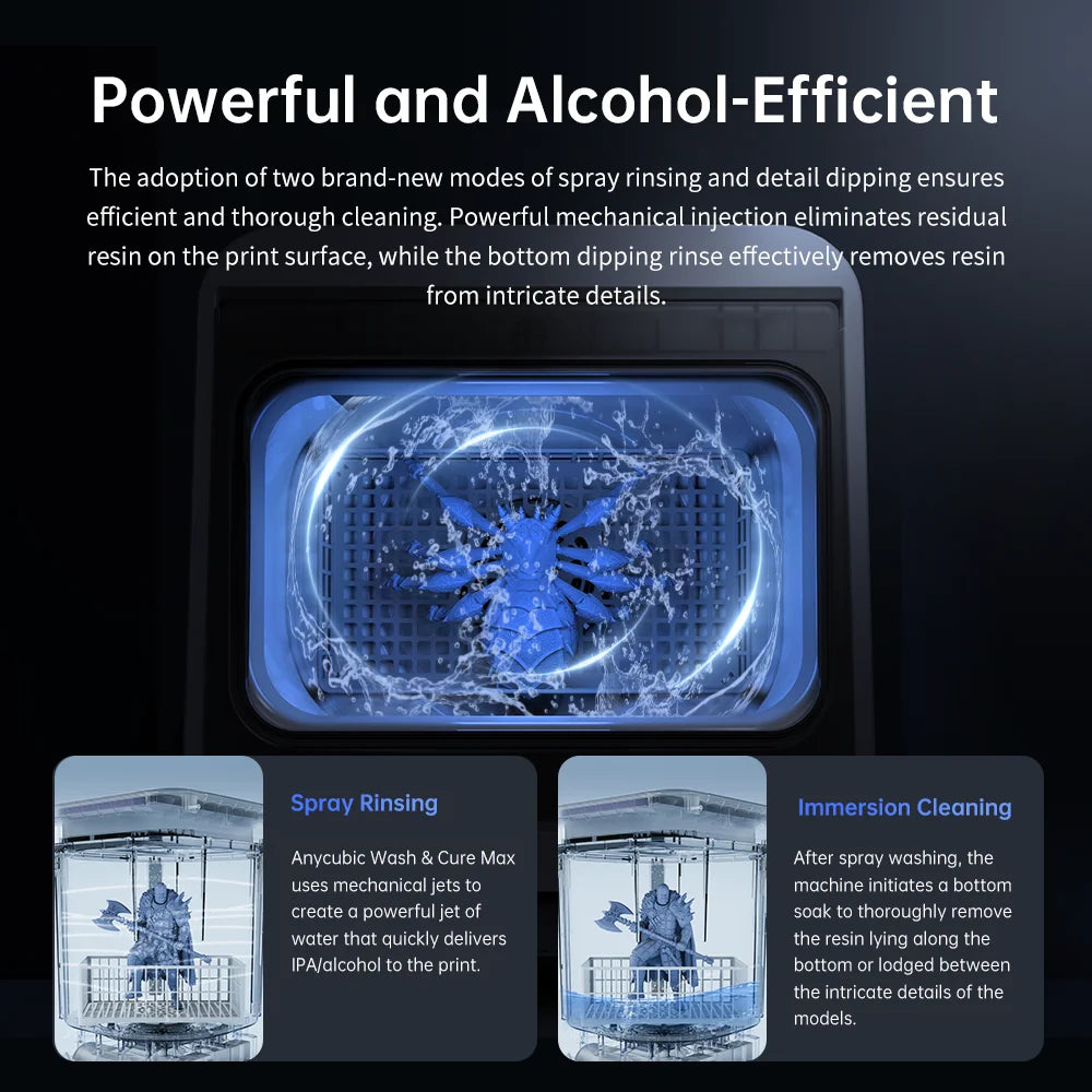 Spray Rinsing: Anycubic Wash & Cure Max uses mechanical jets to create a powerful jet of water that quickly delivers IPA/alcohol to the print.