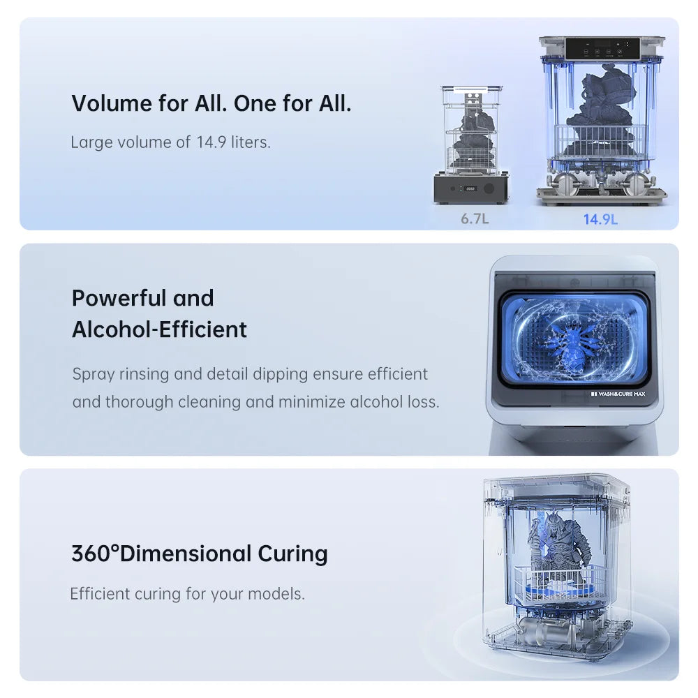 The unit can hold up to 14.9 liters (15.7 qts.), surpassing the sizes of most wash & cure machines in the market. The impressive maximum cleaning size of 300*165*300mm (11.8”x 6.5” x 11.8”) , is compatible with almost every consumer-grade resin 3D printer measuring 13.6”(35 cm) and below available on the market.