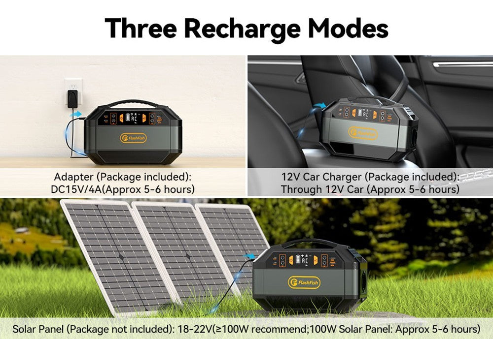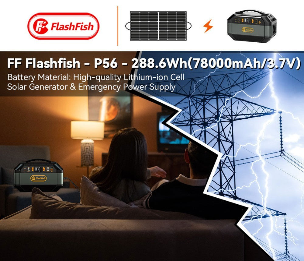 Flashfish P56 outdoor power station has a 288.6Wh capacity, which is ideal for different kinds of electricity demands - outdoor usage for home, cpap machine, power outage, travel, camping, adventure, and long road trips.