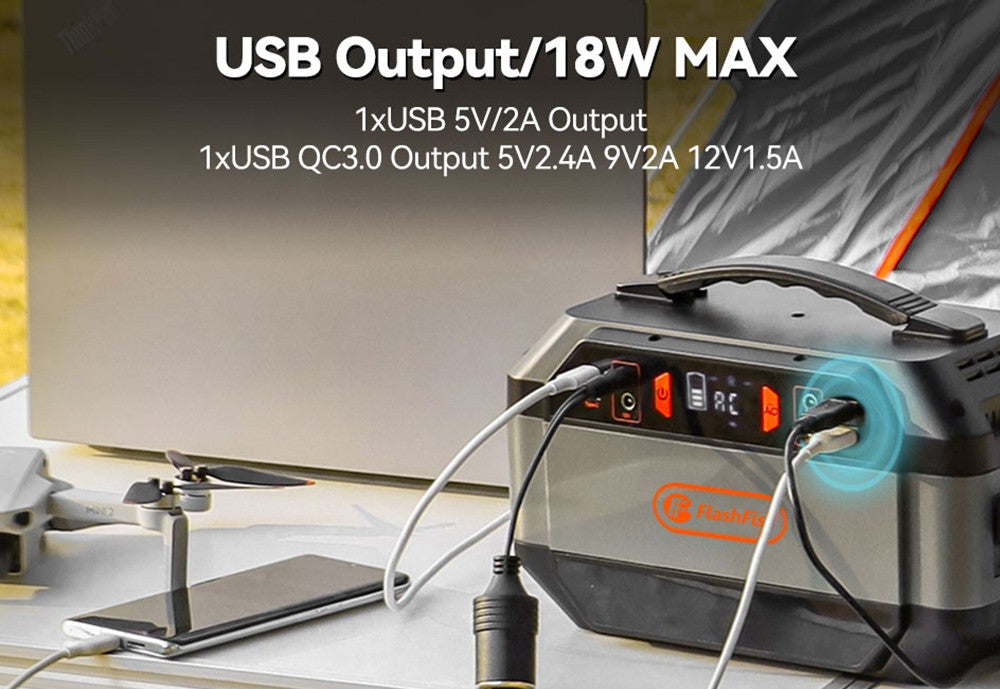 Flashfish P56 portable power station is equipped with 1 x AC outlet (330W, 600W Peak), 4 x DC ports (12V/10A max), 2 x USB-C ports, 1 x QC3.0 USB port, 1 x USB port (5V/2A). It can power your smartphone, laptop, camera, drones, in-car appliances, CPAP machine, refrigerator, blender, and more.