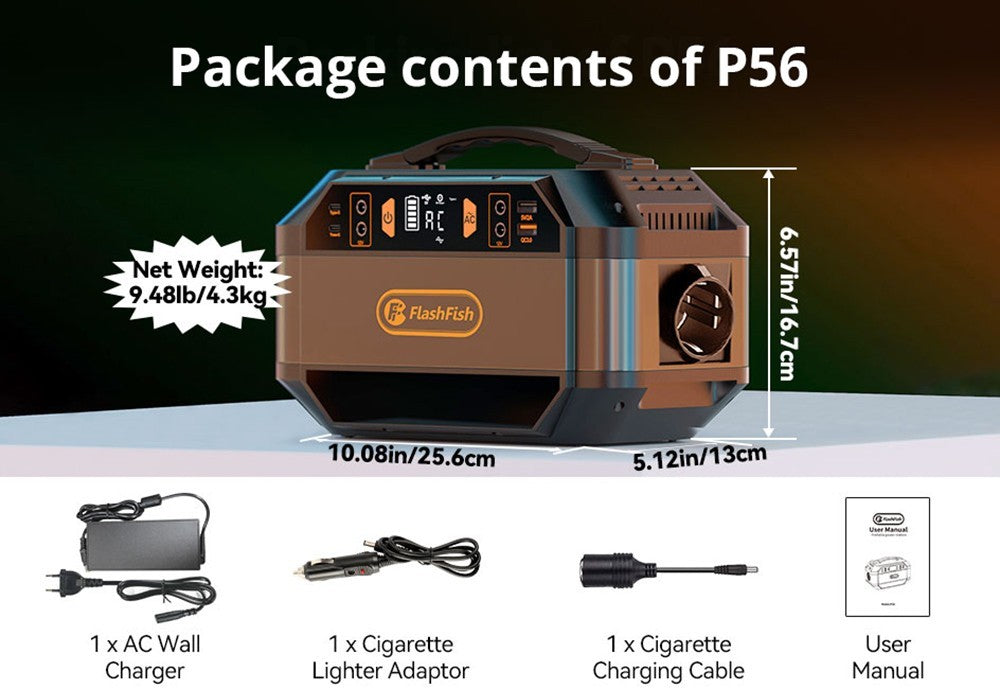 Weights only 4.3kg, Flashfish P56 power station is easy to carry outside. A clear LED screen will show you real-time data, such as battery level, AC/DC mode, AC output, etc.