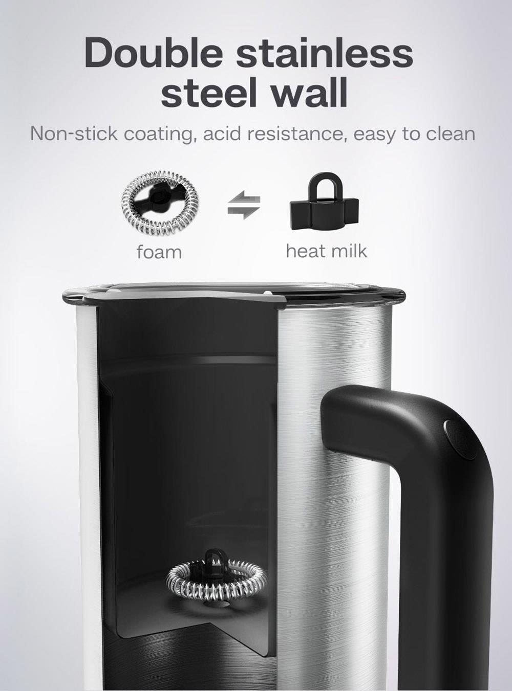With a one-button switch design, it only takes 90 seconds to make rich milk foam. The stainless steel inner wall and non-stick coating make the M3 milk frother extremely durable and easy to clean. In addition, it operates with low noise and virtually no vibration, making it the perfect home milk frother.