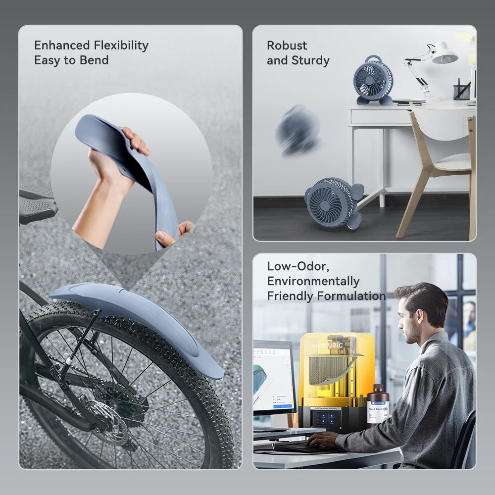 Balancing softness with strength, Anycubic Flexible Tough Resin can withstand bending, flexing,and compression. It shows good strength and elongation and can resit chipping, cracking and stress mark due for cyclic vibration movement.