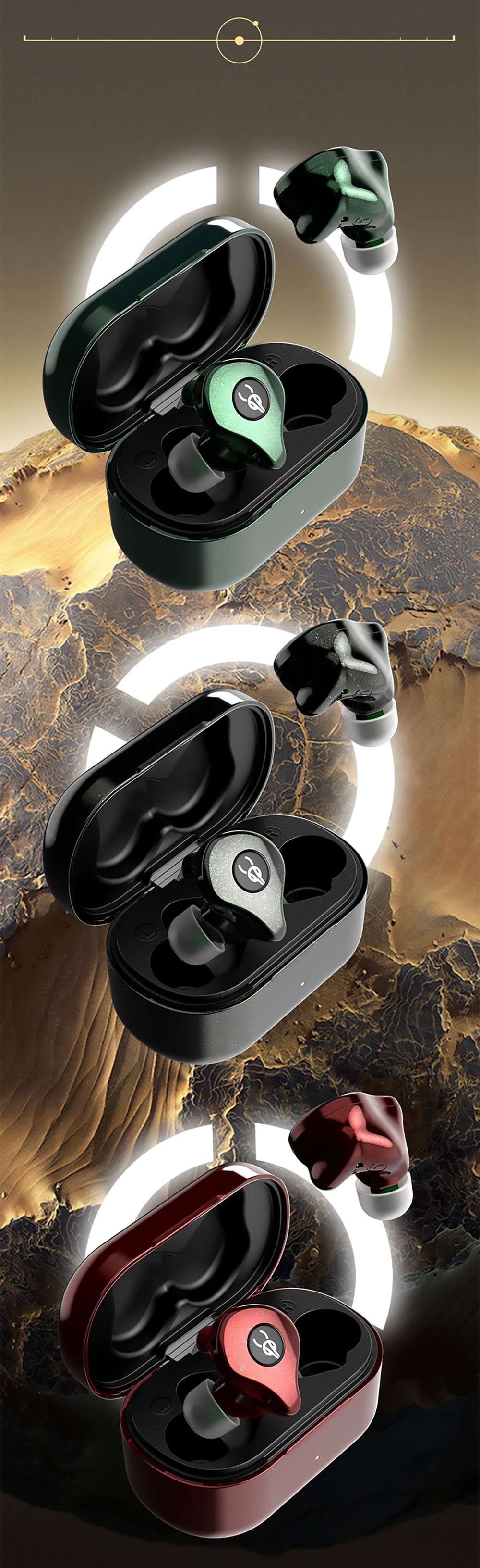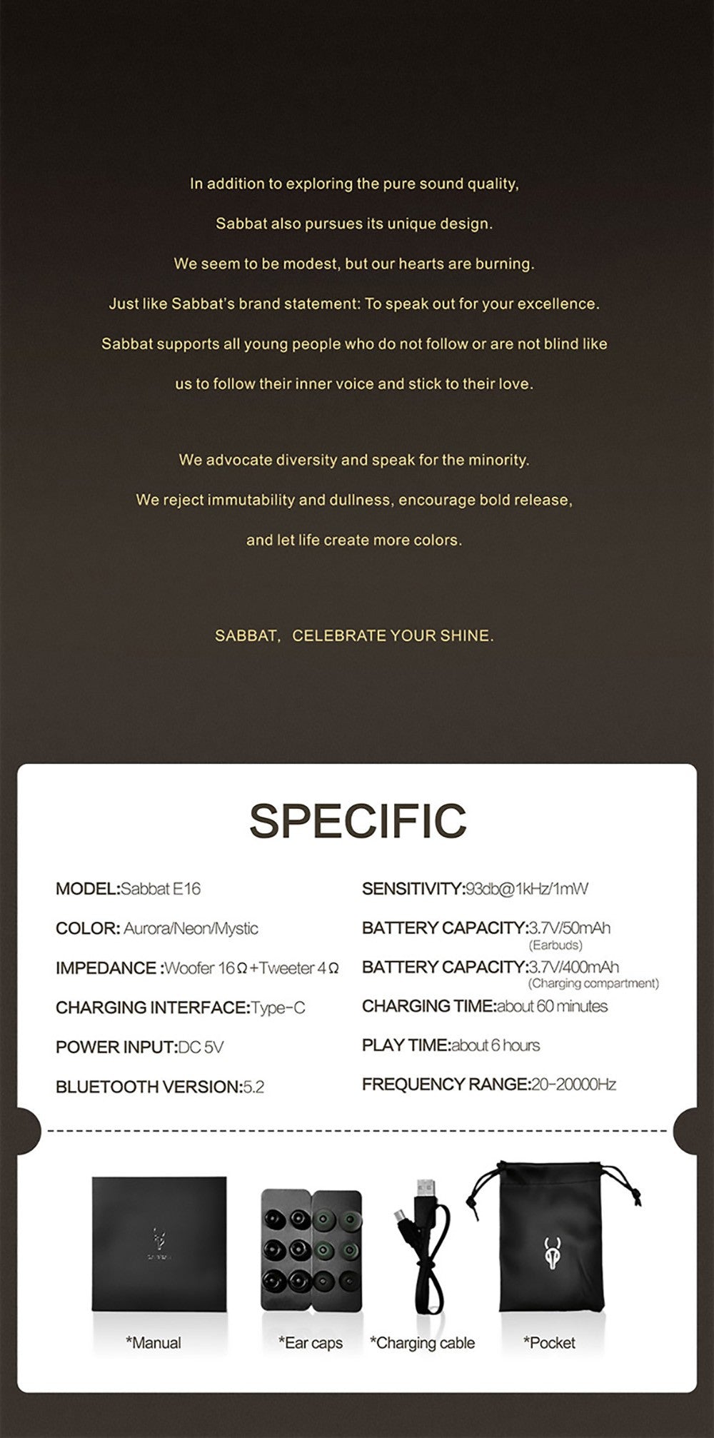 The Sabbat E16 earbuds are available in four fetching colors: Aurora, Neon, Galaxy and Mystic featuring a pleasant metallic lacquer. The earpieces are stored in a beautifully made charging case that has a rechargeable battery on board that can provide 3 complete charges to the earbuds.